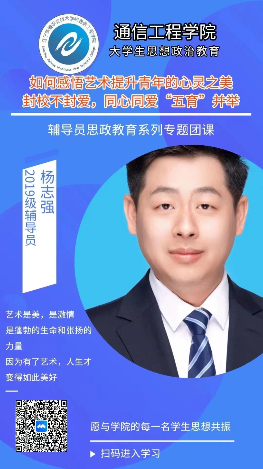 “宅在宿舍”也许会让部分学生产生心理压力和焦虑。杨志强同志认真倾听学生内心的声音,共情式倾听和适当鼓励拉近他与学生之间心与心的距离,建立彼此信赖的关系。他引导学生积极配合学校的防疫政策,响应号召,展现青年风采和青春价值。他按照通信工程学院党总支统一部署,开展辅导员思政教育系列团课,将如何感悟艺术提升青年的心灵之美,封校不封爱的美育案例与大家分享,就此呼唤大家要有美育精神,不断发现美,寻找美,让生活变得美丽而感动。无论是运动还是读书,要具有健康的人生,比如早睡早起,远离低俗的文化,比如运动场上的运动,在草地上读书和思考,甚至可以独自一个人散步。鼓励学生们做到阳光、健康、向善,学做人,学做事,成为拥有人格美的君子们。