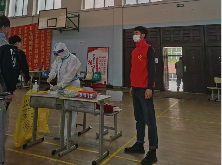 为确保学生安全,我校每周都进行定期的核酸检测,在核酸检测期间,贾宇同学配合学院领导,组织同学们站队,并保证一米间距,查清人数,确保全员进行核酸,不出现遗漏现象。并与领导老师共同完成学生疫苗注射,做到不落下一人,在每次进行注射疫苗工作中,贾宇协助老师做好信息统计、注射情况汇总、间距检查,认真完成工作。