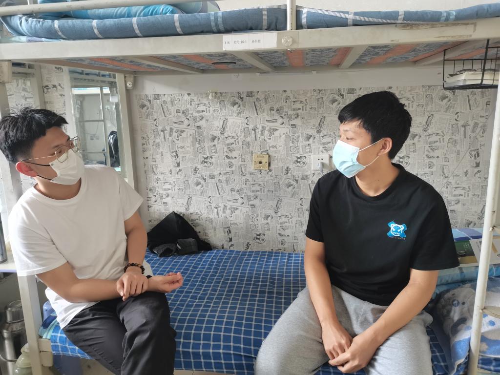 疫情形势严峻,青年志愿者们迅速集结到岗,邹文乐同学作为青年志愿者突击队的一员,以身作则,经常和同学们谈心,询问近期的学习状况,了解其需求与心理状况,对压力过大的同学进行心理疏导。