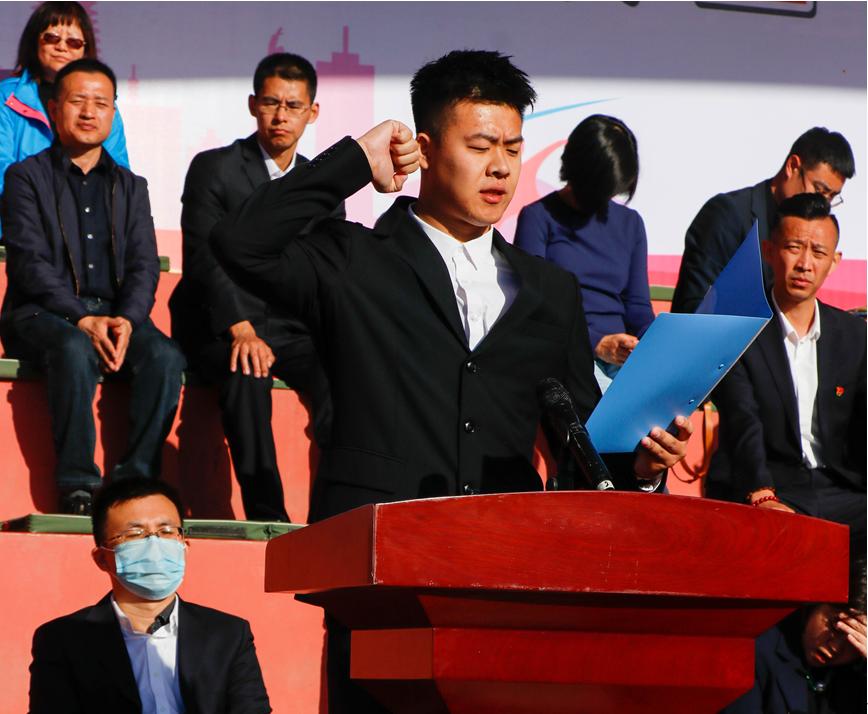 岳贵鑫致开幕辞,向参加运动会的全体运动员、教练员、裁判员和工作人员表示诚挚的问候和衷心的感谢。他表示,运动会是学校的一次体育盛事,是广大师生展示风采、促进交流的舞台,更是各参赛单位集体意识、竞争意识、拼搏精神的综合体现,要把它办成一次凝聚人心的盛会,一次展示辽铁院精神风貌的盛会,一次团结奋进、拼搏进取的盛会。马克思主义学院老师张盈盈、铁道机车学院同学尤鹏博分别代表裁判员和运动员宣誓。