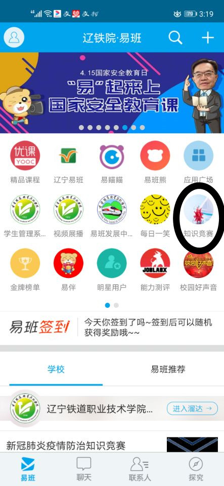 登录易班,请牢记自己的登陆账号与密码,并打开易班app,点击图中知识竞赛即可参与活动。