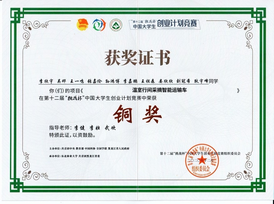 2020年第十二届“挑战杯”全国大学生创业计划辽宁赛区决赛已圆满落下帷幕,我院党员教师李健教师指导的“温室行间采摘智能运输车”项目代表辽宁省进入全国决赛,荣获国家铜奖。