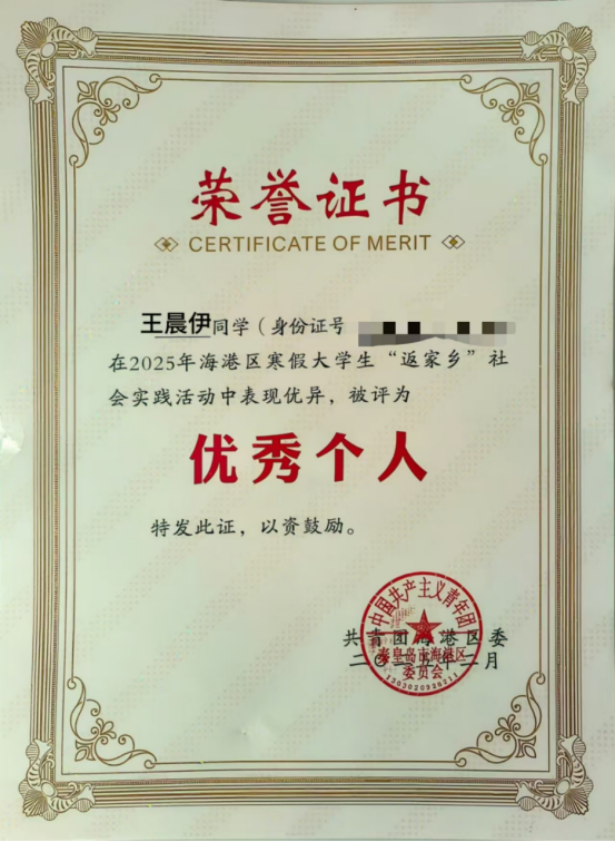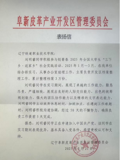 城市轨道交通学院城轨车辆23-1班王晨伊同学,2025年秦皇岛市海港区寒假大学生“返家乡”社会实践活动中,在秦皇岛市海港区石门寨镇人民政府党政综合办公室中实践团委干事一职。负责收发、登记各类文件;接听乡镇人民来电,做好电话记录,解答咨询;整理职工人员请销假记录等。实习期间,王晨伊同学始终保持高度的热情和责任心,面对复杂的工作,迅速掌握工作要点,提高工作效率。在实践活动中表现优异,被评为“优秀个人”。