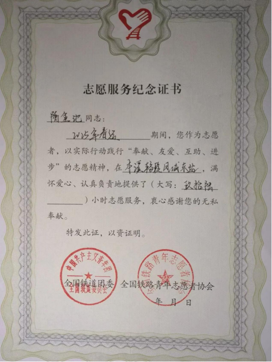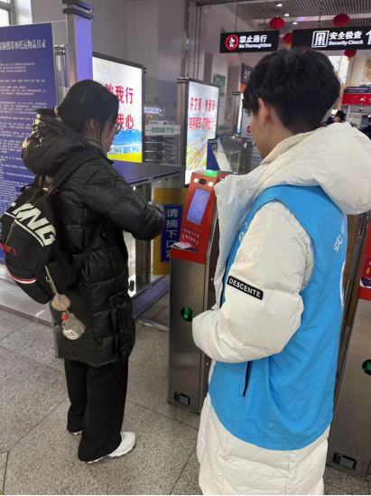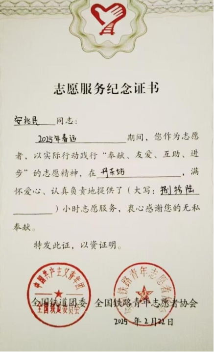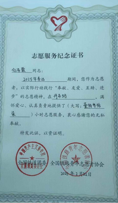 于是在2025年1月他再次参与沈阳铁路局丹东站春运志愿者服务活动,这次作为出站口协助换乘人员进行工作,贯彻“平安春运、有序春运、温馨春运”的理念,作为青年志愿者,协助车站保证春运安全有序进行,得到了车站团委及客运工作人员的一致肯定,同时这次作为学校带队组长,能够有效、合理的组织好志愿者们的工作,作为车站和学校之间沟通的桥梁纽带,高效的完成了自己的任务。