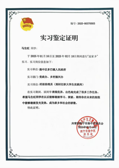 马生旺同学展现出的高度责任心、积极的工作态度和出色的实践能力,充分体现当代大学生的良好精神风貌。希望马生旺同学再接再厉,也期待更多青年学子积极投身家乡建设。