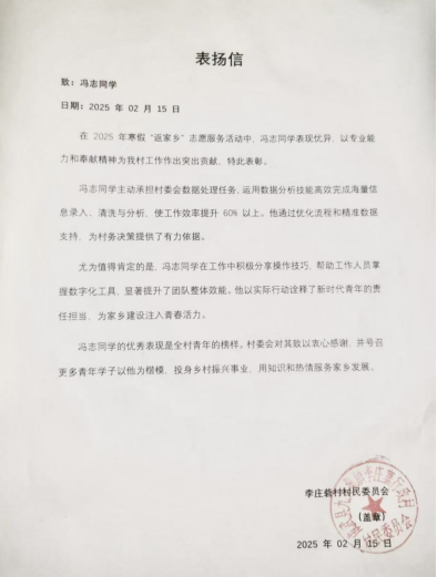 在近期的返家乡志愿活动里,冯志同学于本村村委会的工作表现十分亮眼,特此表扬。