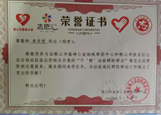 城市轨道交通工程技术24-1班李京哲同学利用假期回到家乡,主动报名参加了当地的义警活动,在服务期间,李京哲同学表现优异,尽职尽责,特此表彰。