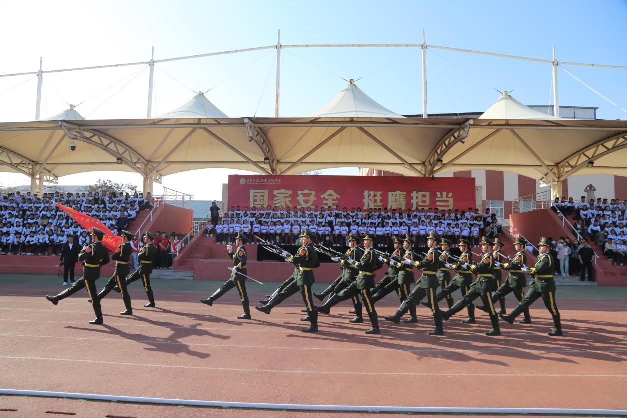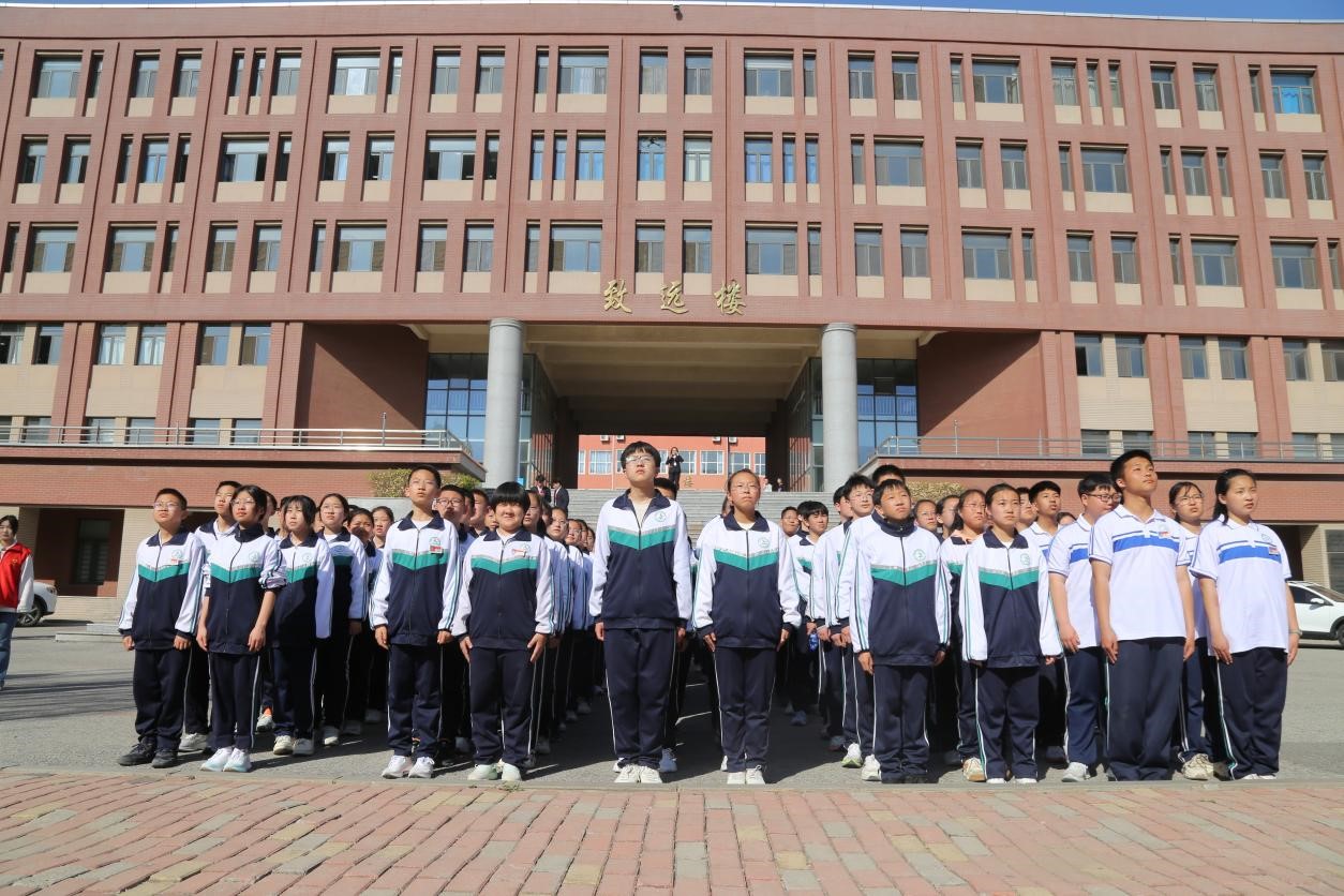 三中师生一同到操场观看国旗护卫队队列式展示、军乐队演奏、匕首操表演和校园美育文化展演。