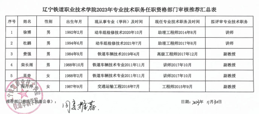 铁道车辆学院2023年专业技术职务任职资格部门审核推荐结果公示