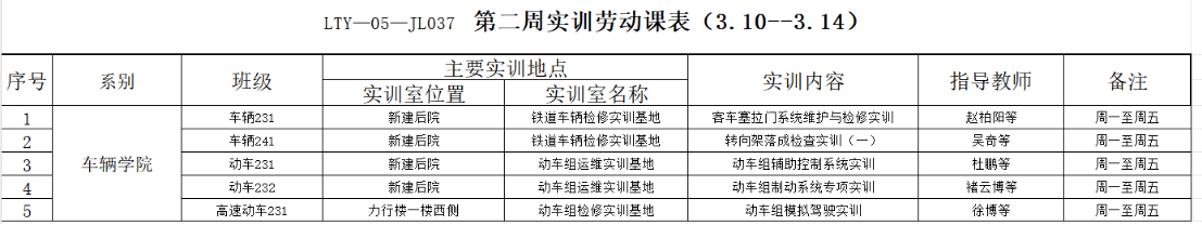 定于本学期第二教学周(2025.3.10-3.14)由车辆23-1班进行《客车塞拉门维护与检修》实训,车辆24-1班进行《转向架落成检查》实训,动车23-1班进行《动车组辅助控制系统》实训,动车23-2班进行《动车组制动系统》专项实训,高动23-1班进行《动车组模拟驾驶》实训。望各位同学、班主任和任课教师周知。