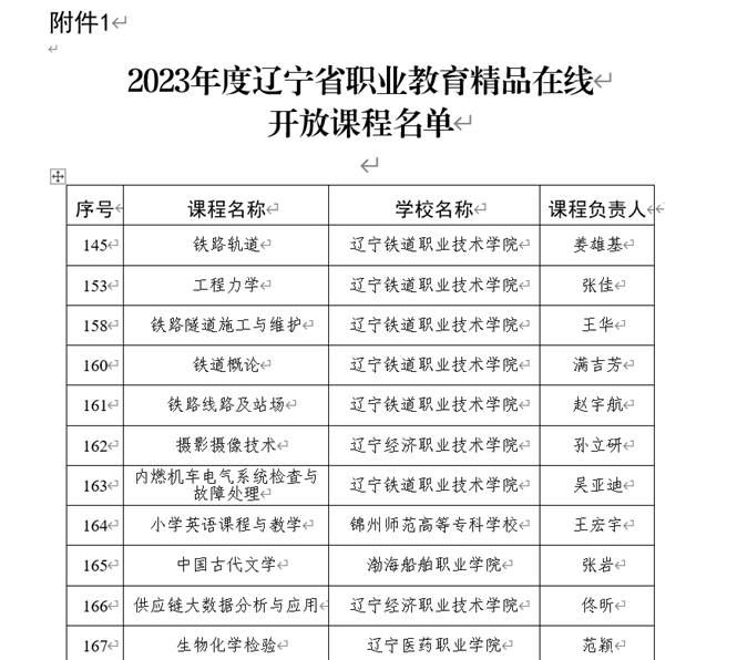 近日,辽宁省教育厅公布2023年职业教育在线开放精品课程认定结果,此次评选经院校推荐、专家评审、社会公示等环节,全省共认定高职课程206门,铁道工程学院《铁路轨道》《工程力学》《铁路隧道施工与维护》《铁道概论》4门课程成功入选。标志着我院在数字化教学改革与课程资源建设方面取得重大突破。