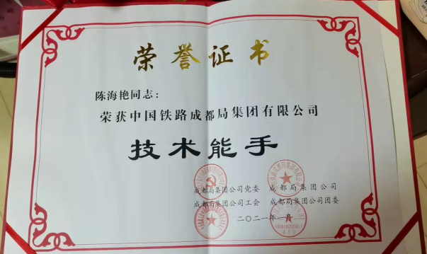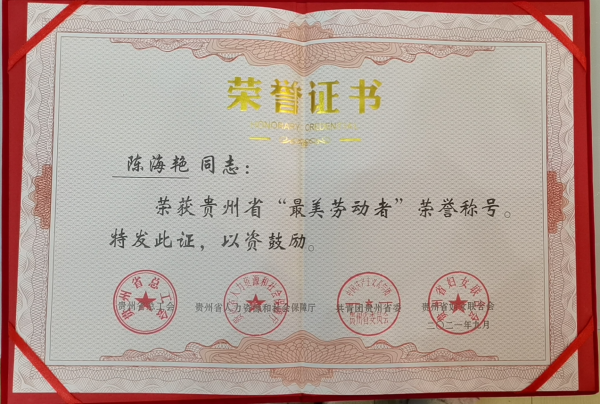 陈海艳,女,满族,1992年11月7日出生,辽宁锦州人,大专学历,共青团员,现任贵阳南车辆段检修车间探伤班副工长。自入路以来先后获得“全路技术能手”、“先进生产工作者”、“青年标兵”、贵州省“最美劳动者”等荣誉称号。