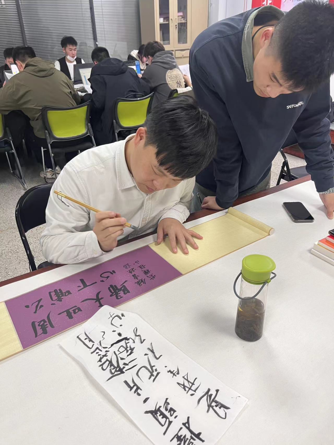 党总支副书记兼分团委书记陈大千在书法比赛过程中,耐心指导,细心的为每位同学讲解写作要点,传授写作经验,让每位同学都可以更深层次的理解书法的魅力,传承雷锋精神。使得同学们在书法比赛过程中,都能体会到雷锋同志的精神。