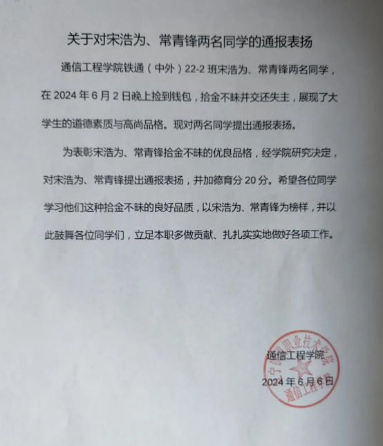 通信工程学院铁通(中外)22-2班宋浩为、常青锋两名同学,于2024年6月2日晚在锦州站拾到一个钱包,两位同学捡到后,拾金不昧并交还失主。