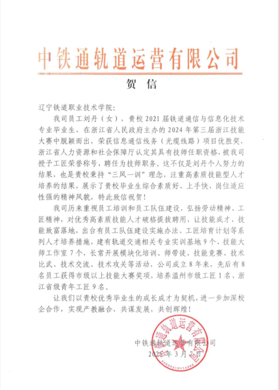 在生机盎然的季节,我院再传佳绩!2021届铁道通信与信息化技术专业毕业生刘丹在毕业后投身工作,凭借卓越表现赢得了中铁通轨道运营有限公司的高度认可,其工作成果斐然,单位特向我校发来热情洋溢的贺信。