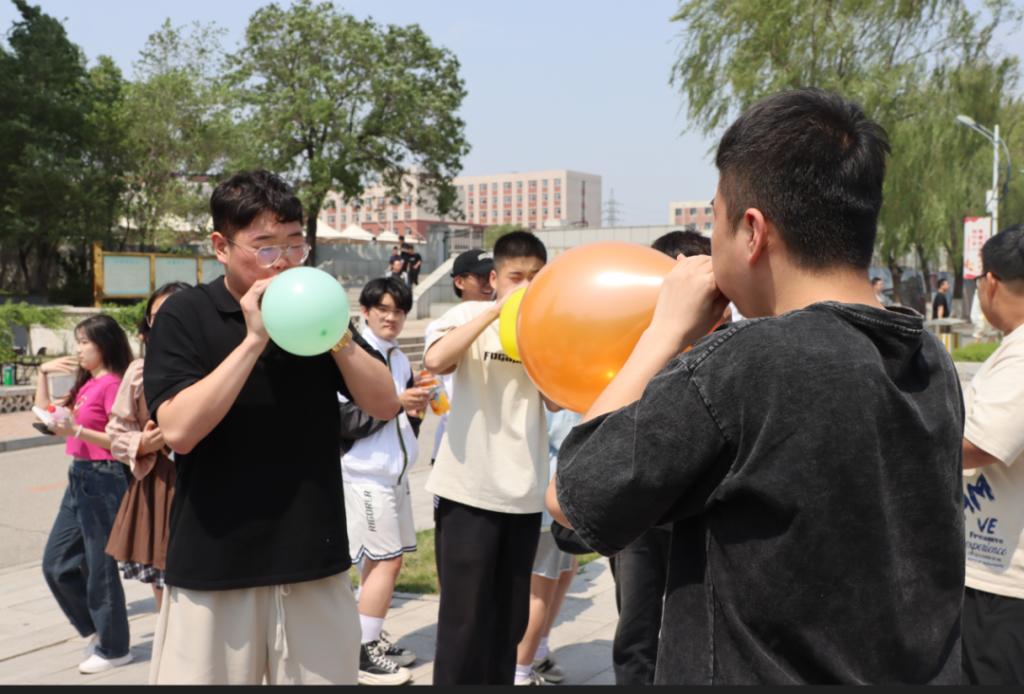 快!一鼓作气!气球马上被吹爆了!同学们鼓着嘴,竭力将自己肺部的空气送入气球。“崩!”胜利的同学在气球的祝贺声中笑容满面。
