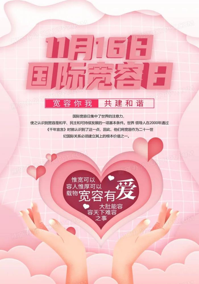每年11月16日是“国际宽容日”,联合国教科文组织设立这个纪念日,是想提醒人们学会宽容,换位思考以及相互尊重。宽容是世界上最美好的字眼,它有着非凡的气度、仁爱的光芒,它既能释放别人,也能善待自己,更是一个人无与伦比的内在魅力。