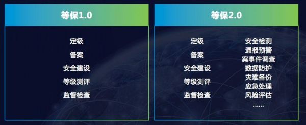 除了满足等保1.0时代定级、备案、安全建设、等级测评和监督检查五个规定动作以外,等保2.0把安全检测、通报预警、案事件调查等措施都将全部纳入等级保护制度并加以实施。
